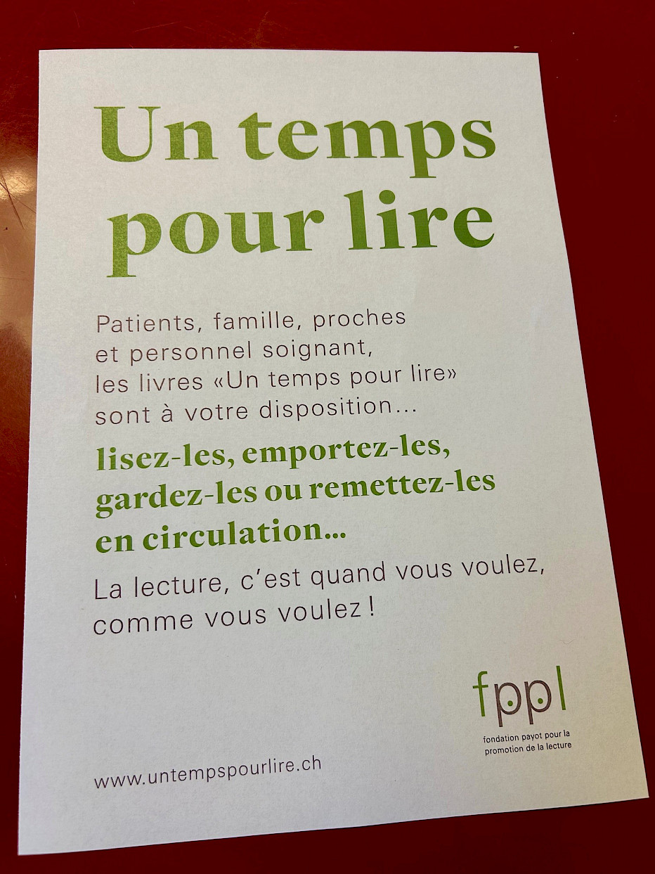 Un immense merci à la Fondation Payot pour la promotion de la lecture, pour la mise à disposition des livres ainsi qu'à notre Collectif des collaborateurs de l'Hôpital de Moutier qui a permis à ce projet de voir le jour!